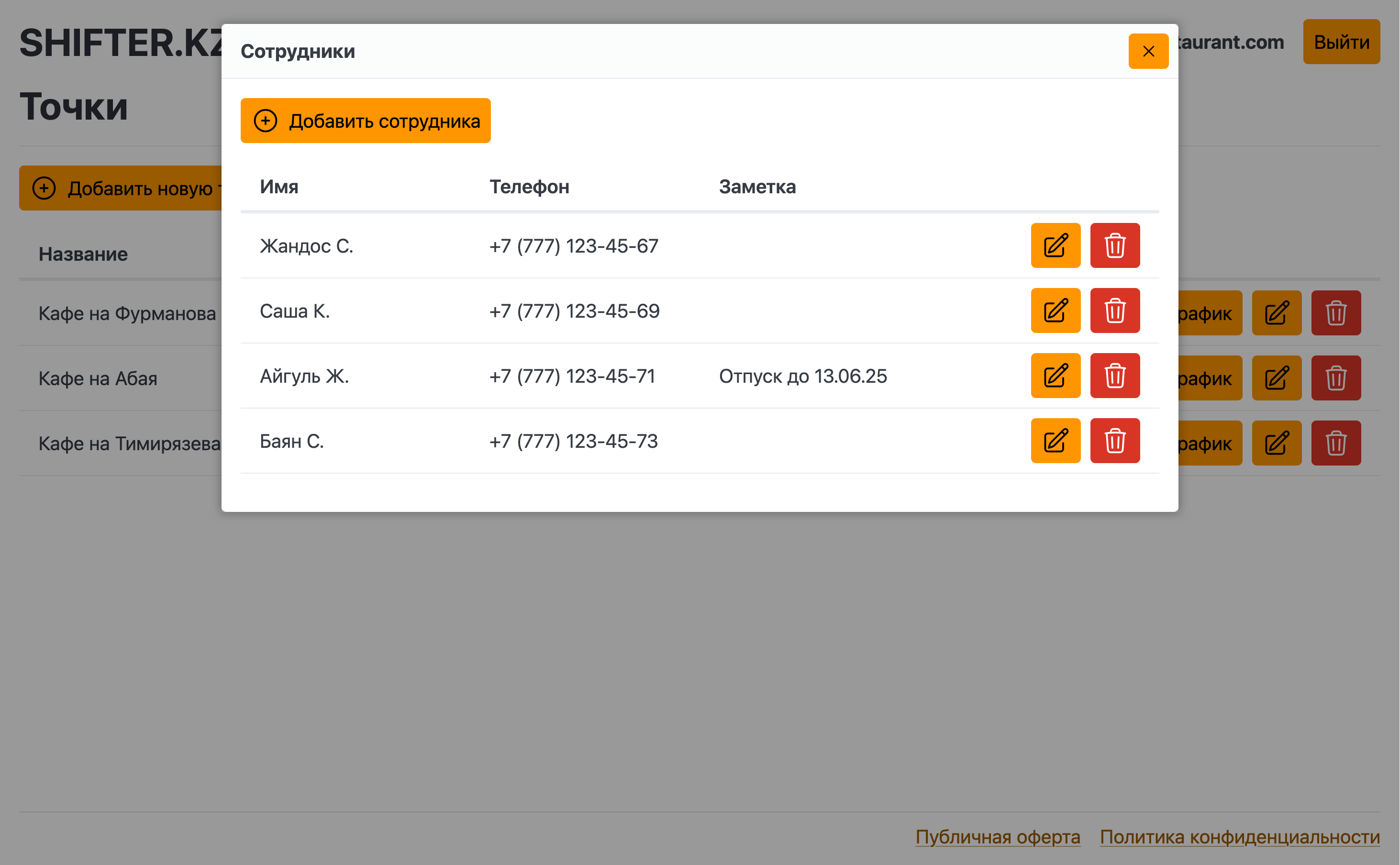- Доступ сотрудников к телеграм-боту Shifter.kz
