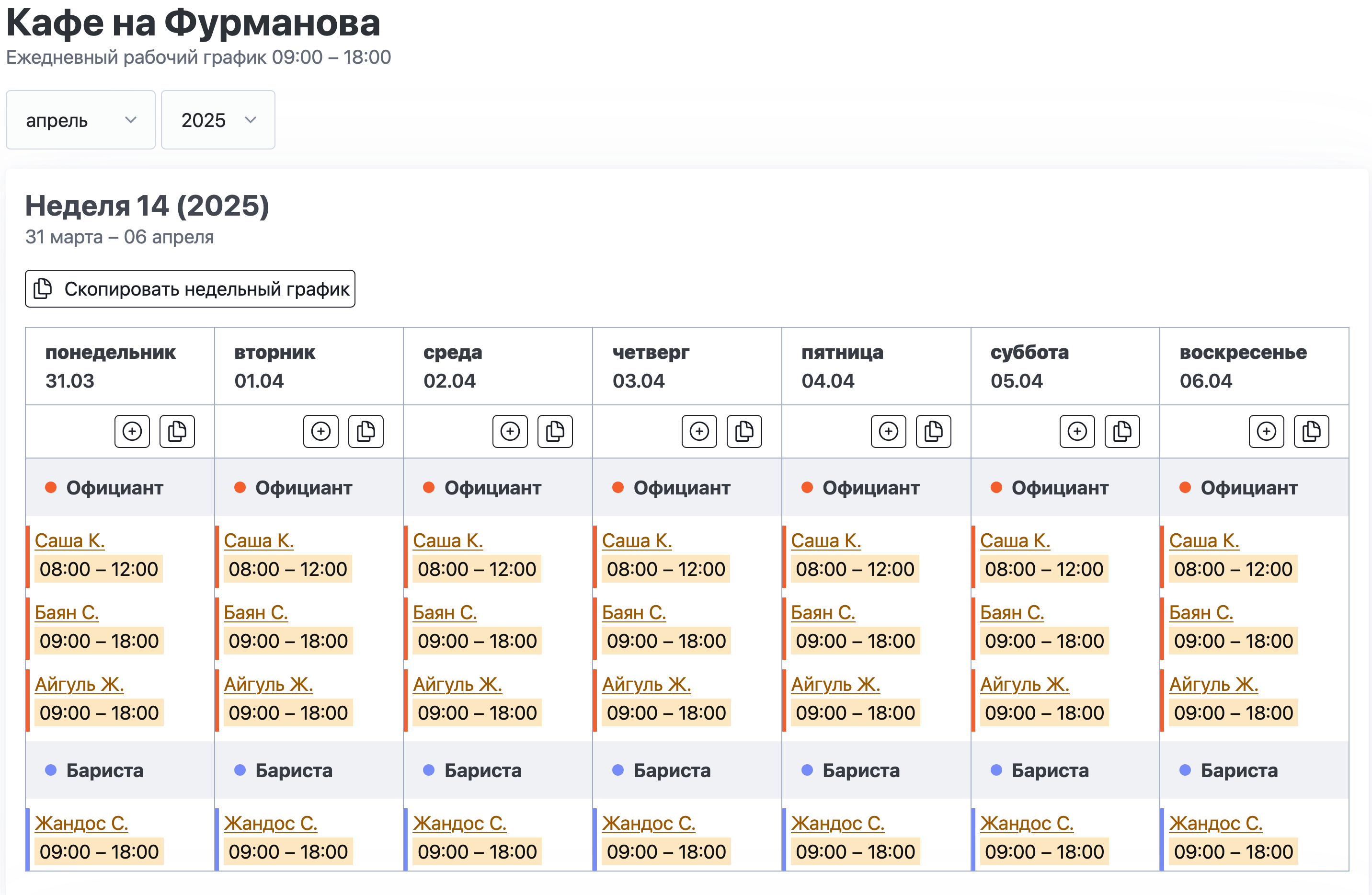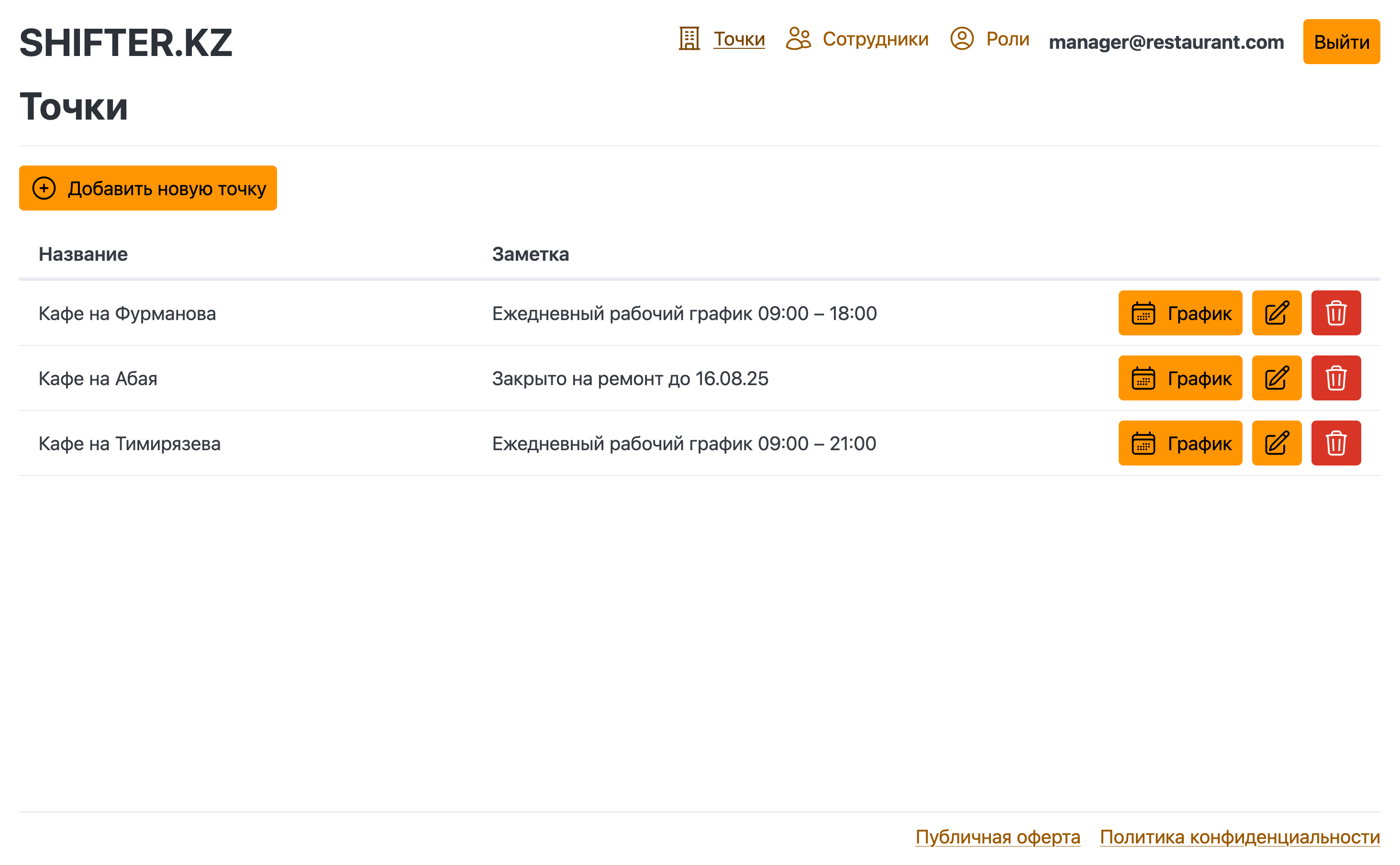 - 🗓️ Планируйте рабочий график ваших торговых точек (магазинов, кафе, ресторанов, клиник, и т.д.)